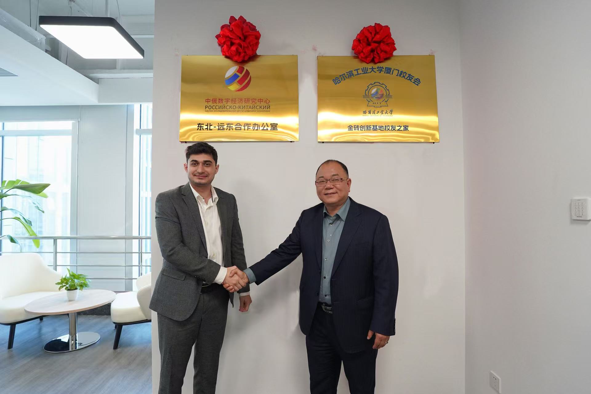 最后,双方举行了哈尔滨工业大学厦门校友会·金砖创新基地校友之家、金砖创新基地数字经济研究中心·东北-远东合作办公室揭牌仪式。沙明表示,中心作为国际科技孵化与产业化合作平台,拥有丰富“金砖+”国家政府、高校和企业资源,期待双方以此次揭牌活动为基础,把东北-远东合作办公室工作做深做实,共同构建深耕厦门、覆盖中俄、辐射“金砖+”的数字领域政产学研用协同发展网络。